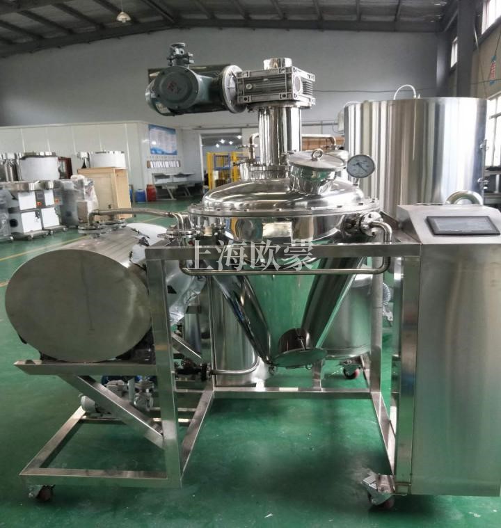 本機(jī)由加熱錐體設(shè)有加熱夾套,熱源為熱水、導(dǎo)熱油或低壓蒸汽,從而使錐體內(nèi)壁保持一定的的溫度。變頻調(diào)速電機(jī)經(jīng)平行斜齒輪減速機(jī),驅(qū)動(dòng)單螺帶攪拌器旋轉(zhuǎn),帶動(dòng)物料沿錐型筒旋轉(zhuǎn)并自下而上提升,物料到達(dá)頂后由重力和慣性作用,自動(dòng)流向旋渦中心回到錐型筒體底部,整個(gè)過程使物料在錐型筒體內(nèi)強(qiáng)制加熱,相對對流、摻混,熱量在物料中相互擴(kuò)散,使物料作全方位的不規(guī)則往復(fù)運(yùn)動(dòng),完成物料在筒壁表面進(jìn)行高頻率傳熱交換,在短時(shí)間內(nèi)達(dá)到加熱干燥的效果。從而使物料內(nèi)部水份不斷蒸發(fā),在真空泵的作用下,水蒸汽由真空泵引出,如須回收液體可加冷凝器、回收液儲(chǔ)罐回收。干燥完成后,打開下部的出料閥出料。