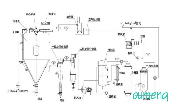 裝置**針對于有機溶劑,以使用循環(huán)氮氣而形成的惰性氣體介質(zhì)取代通常的空氣介質(zhì),來進行噴霧干燥。除了能回收產(chǎn)品之外,尚可回收有機溶劑。針對有機溶劑低閃點或者微毒的特點,易燃易爆的特點**設(shè)計該套閉式循環(huán)噴霧系統(tǒng)。